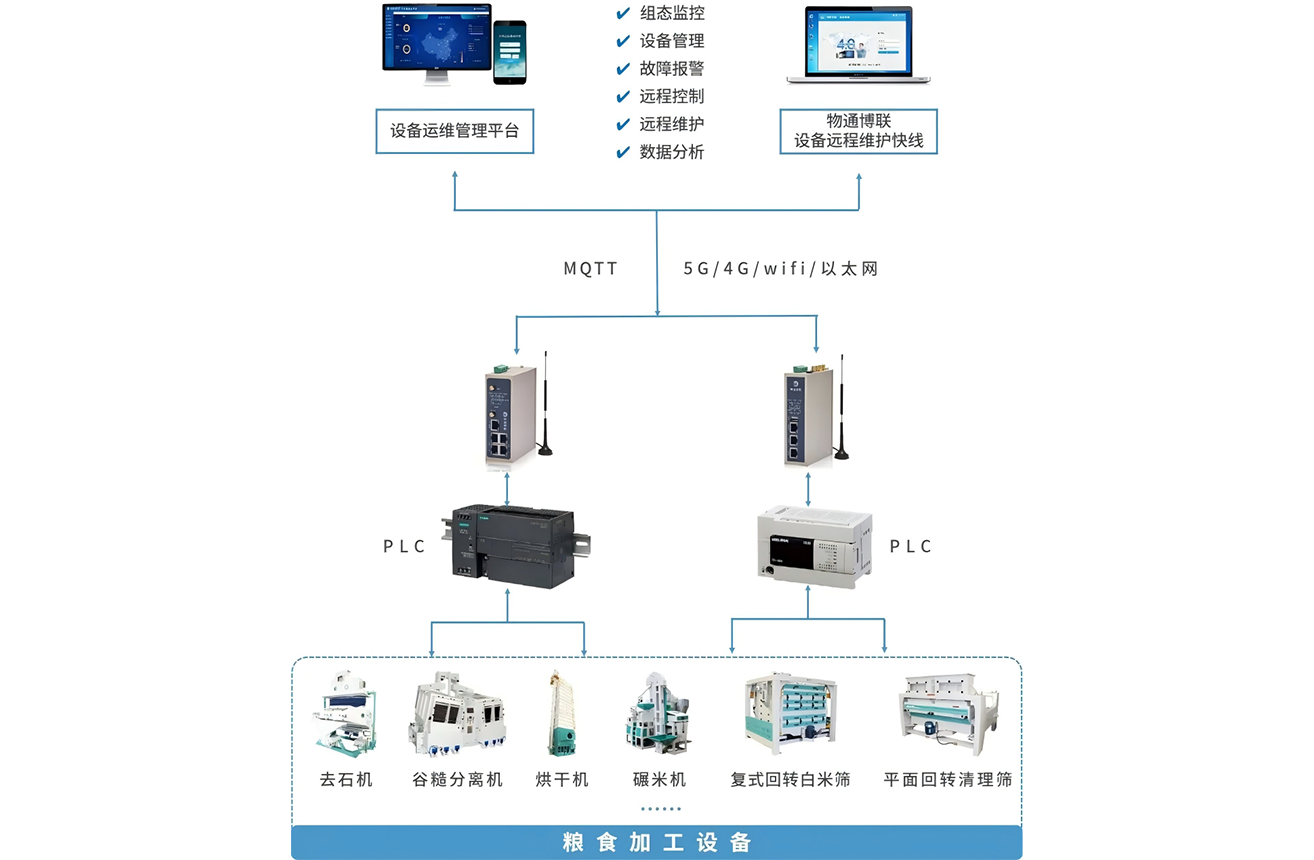 物通博聯提供基于工業智能網關的糧食加工設備遠程監控智慧運維系統解決方案。通過將去石機、碾米機、拋光機、烘干機的控制器PLC接入到物通博聯工業智能網關,網關就能采集設備數據并通過5G/4G網絡上傳到設備運維管理平臺中,從而實現對設備位置分布、數量類型、運行狀態、告警事件、運維工單等監控和管理,從而綜合運用大數據分析技術,驅動企業運營決策與服務升級,有效加強售后市場建設,增強市場競爭力。