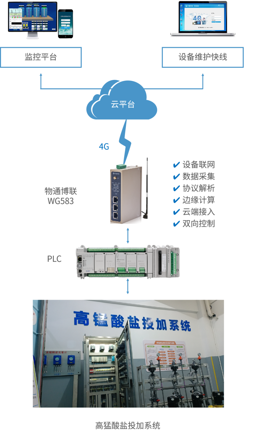 該自來水公司是一家致力于“供排水一體化、城鄉水務一體化、投資建設運營一體化”的水務一體化運營企業。本次項目使用物通博聯工業智能網關+IOT云平臺搭建高錳酸鹽投加設備物聯網系統,旨在實現對自來水廠水務進行智慧管理,確保穩定高效運行。